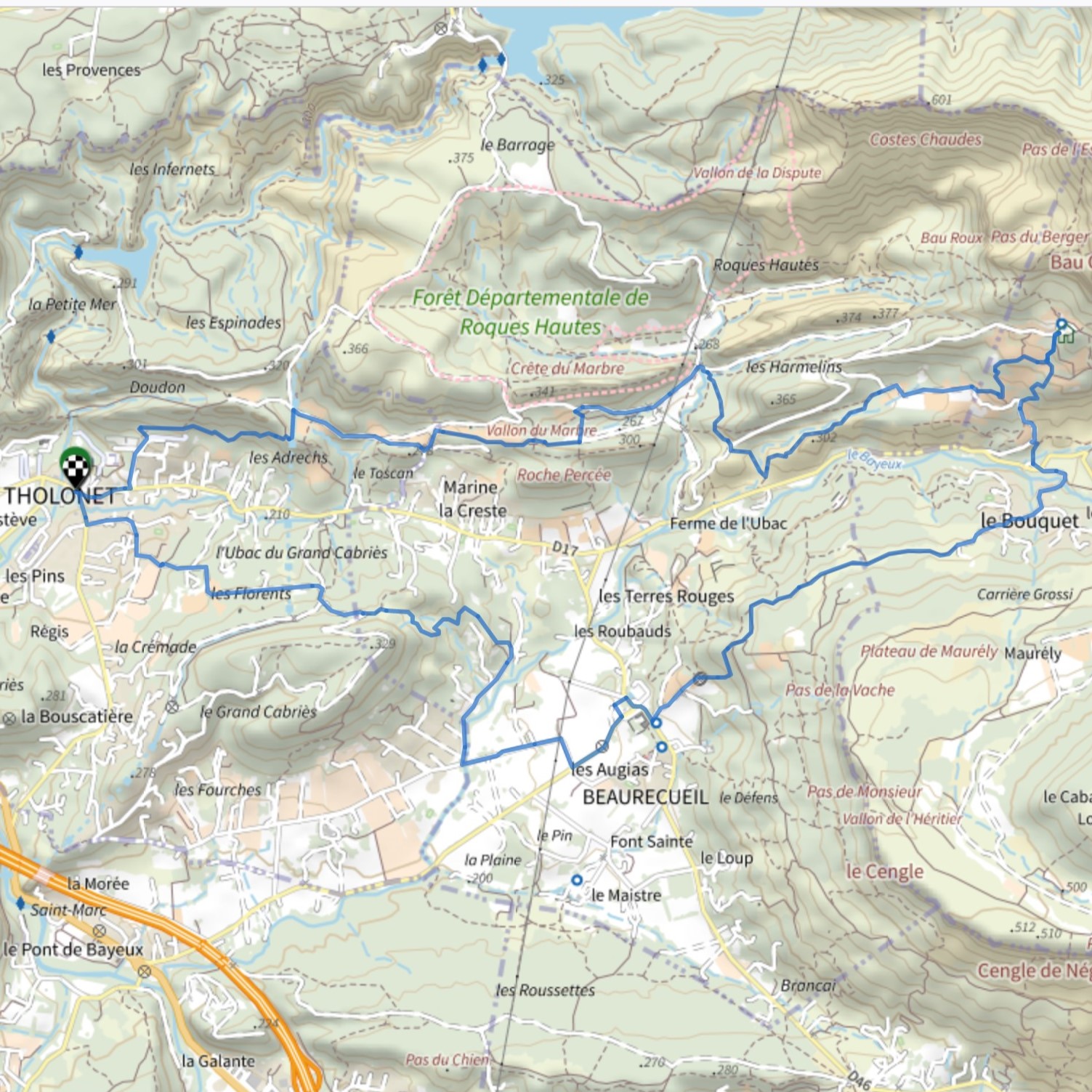 Le sentier s’élève sur le flanc du Grand Cabriès et le contourne par le Nord en traversant notamment des terres rouges. Le sentier redescend et rejoint le chemin du Bayon, poursuivre plein Sud ce sentier en longeant le Bayon. Il croise le chemin de la Poudrière que l’on prend sur la droite pour rejoindre 500 m plus loin la D58K jusqu’à la maison de retraite de Beaurecueil. Prendre sur la droite le chemin Sylvain Gautier puis 100m plus loin, à gauche le chemin du Bouquet. Ce chemin grimpe sur le flanc du plateau du Cengle et le contourne par le Nord pour redescendre et traverser le hameau Le Bouquet.