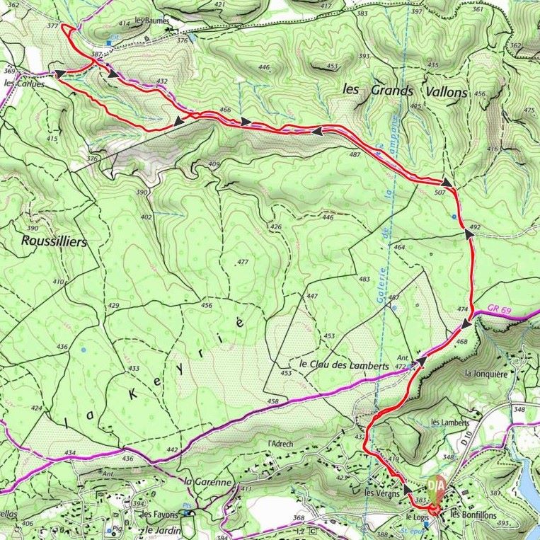 Informations sur le circuit (voir ci contre la Trace de référence du circuit, plusieurs petites variantes sont possibles, attention, à l'extrémité de cette trace il manque le petit aller-retour jusqu'à la ferme Les Baumes).