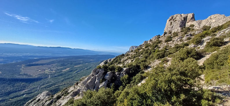 .Informations sur le circuit :Une randonnée en versant sud de Ste Victoire, époustouflante ! (voir TRACE ci-contre, parcours dans le sens des aiguilles d'une montre). La boucle commence sur le parking à gauche en bord de route sous le Relais de Saint-Ser. L’itinéraire rallie le GR9 de la Crête au niveau du Pic des Mouches (1011 m) après avoir remonté le très sauvage Vallon de la Tine. Puis plein est, il longe la crête et redescend en versant sud au niveau du Garagaï de Cagoloup, passe à proximité de la Grotte du Marin (prévoir lampe frontale ou autre) avant d'aller rejoindre un peu plus bas le sentier de l'aller, pour un retour au parking. La balade offre de superbes points de vue sur tous les massifs environnants grâce notamment à un 360° au Pic des Mouches.