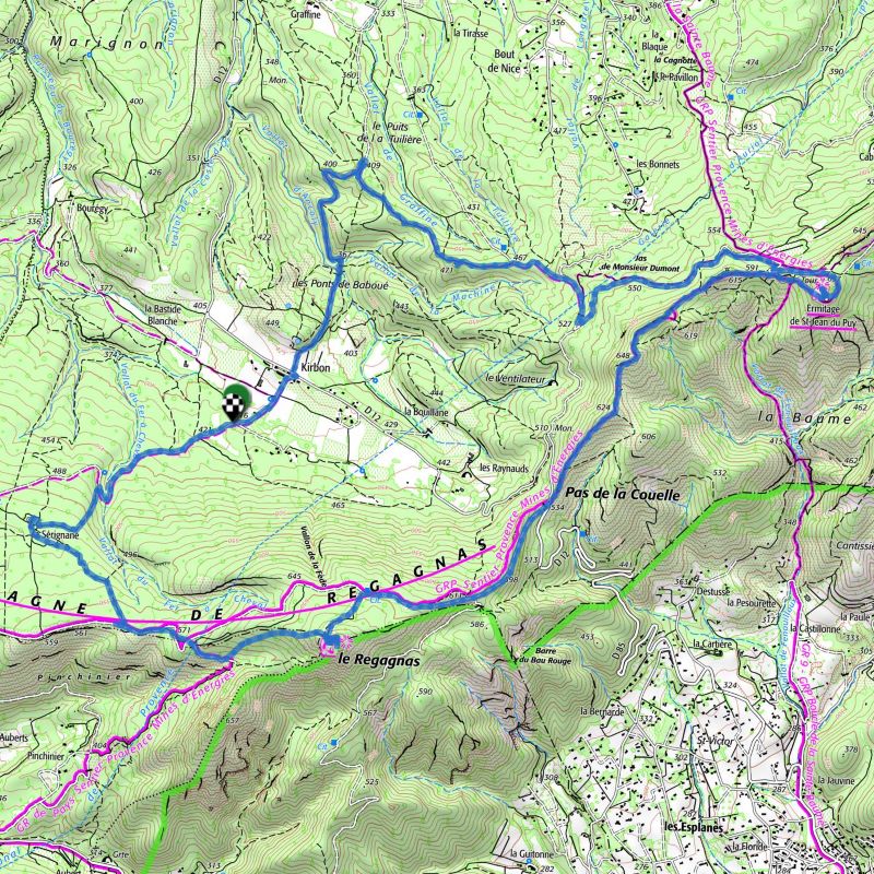 Le parcours démarre NNE (cf. carte) en direction des Ponts de Baboué, puis une montée progressive, bien balisée, mène à St Jean du Puy (ermitage fondé au 5ème siècle) et à sa tour de guet (datant de 1828). Après une pause à l'ermitage, descente vers le Col de la Couelle, lieu bien adapté pour une pause pique-nique. Ensuite, montée à la vigie du Regagnas (petite montée de 170 m sur environ 2km) pour un magnifique 360° (Sainte Victoire, Sainte Baume, Haute vallée de l’Arc...). Le retour s’effectue par la ferme de Sérignane (qui, parait-il, a abrité autrefois une fabrique clandestine de pastis...).