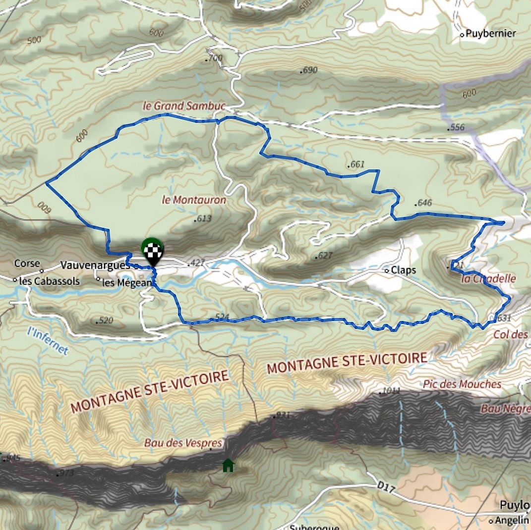 Boucle au départ de Vauvenargues, au Parking situé en face de l'hôtel Ste Victoire (27 Av. des Maquisards). Le tracé mène par pistes et sentiers au pied du grand Sambuc, puis à la Citadelle (731 m)(remarquable vue sur toute la vallée de Vauvenargues et bien sûr, sur Ste Victoire et le Concors), puis retour par le Col des Portes.
